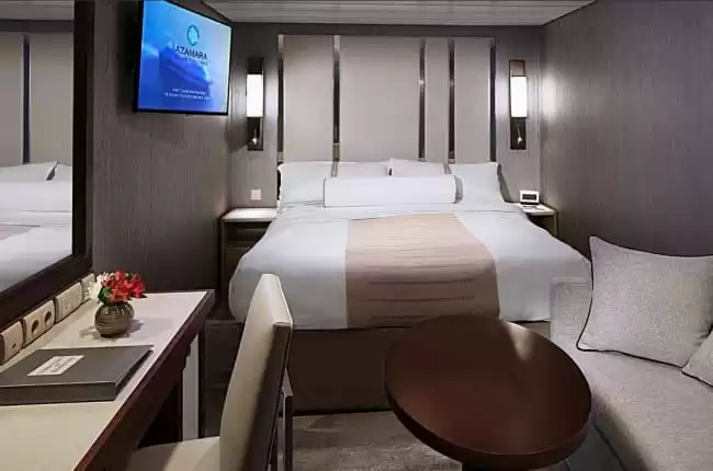 Vantaggi della cabina: Serate AzAmazing® (sulla maggior parte delle crociere), mance incluse, biancheria da letto in cotone con piumone, accappatoi e pantofole, selezione di alcolici standard, birre e vini internazionali, servizio in cabina 24 ore su 24, acque minerali, bevande analcoliche, caffè e tè speciali, fiori freschi, lavanderia self-service, tote bag, navetta per il porto quando disponibile, prestito di ombrelli, servizi di portineria, lustrascarpe, piccoli ritocchi al servizio serale, notiziario quotidiano.