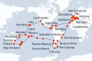 Il vantaggio principale di una crociera intorno al mondo è che permette di scoprire moltissimi Paesi, città e porti durante un unico viaggio in mare. In generale, l'atmosfera e la cucina a bordo della nave si adeguano alla regione o al paese attraversati dalla crociera. Per chi vuole, è possibile effettuare solo un tratto della crociera intorno al mondo. Questo vi permetterà di ridurre di molto il prezzo del biglietto e di scegliere solo il pezzo di itinerario che vi interessa di più, come ad esempio il Sud America o l'Oceano Pacifico.