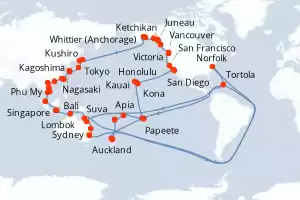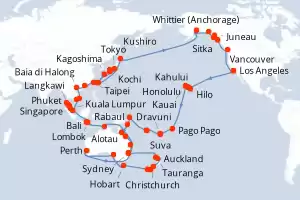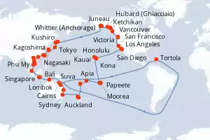 Una crociera intorno al mondo è un'occasione per esplorare tutti i continenti e per scoprire un’enorme varietà di paesaggi, dall'estremo nord fino agli atolli paradisiaci della Polinesia. Si tratta di viaggi unici a bordo di una grande nave da crociera. La maggior parte delle compagnie di crociera propone questo tipo di viaggio una sola volta all'anno.